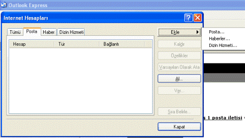İnternet Hesapları penceresinde, Posta sekmesine tıkladıktan sonra, Ekle alt menüsünden Posta 'ya tıklayın. | |